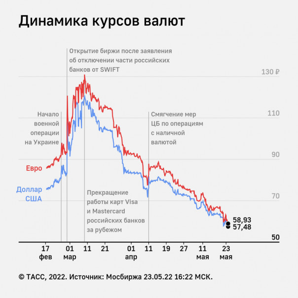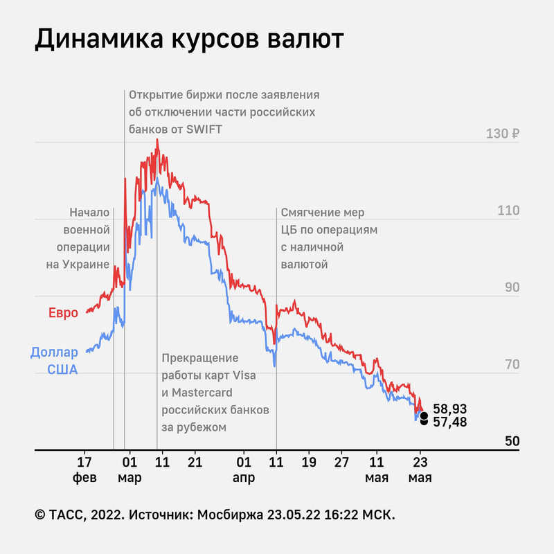 Курс евро на Мосбирже упал до 58,77 руб. (- 6,45%) впервые с июня 2015 г. Доллар подешевел до 57,47 руб. (- 4,59%).