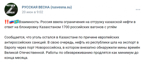 Сообщается, что уголь остался в Казахстане по причине европейских антироссийских санкций. В свою очередь, нефть из республики шла на экспорт в Европу через порт Новороссийска, в котором внезапно обнаружили мины времён Великой Отечественной. Работы по обезвреживанию продлятся как минимум до конца месяца.