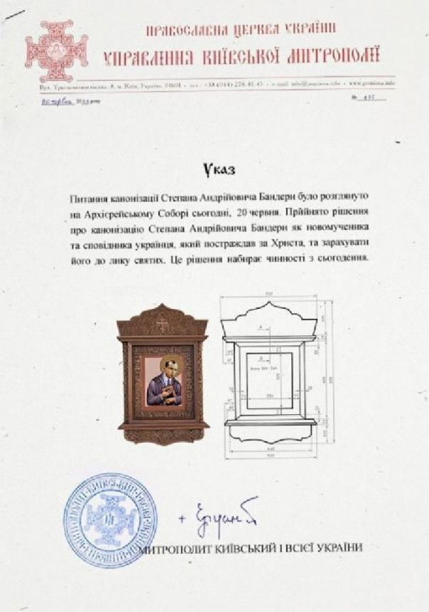 Архиерейский собор раскольнической Православной церкви Украины (ПЦУ) официально причислил к лику святых Степана Бандеру.