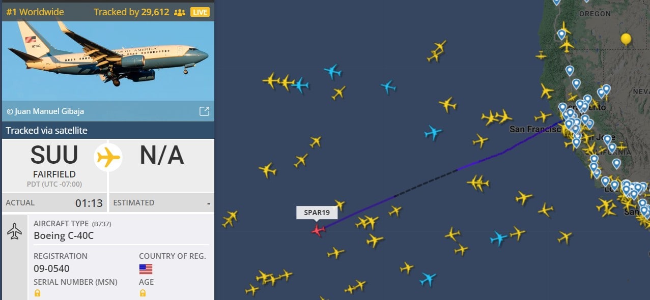 Самолет Boeing C-40 со спикером палаты представителей Конгресса США на борту вылетел с авиабазы Эндрюс. Он взял курс на Тихий океан. В стороне, куда следует самолет — Япония, Корея и Сингапур, где у Пелоси также назначены визиты. Куда конкретно вылет — пока не сообщается.