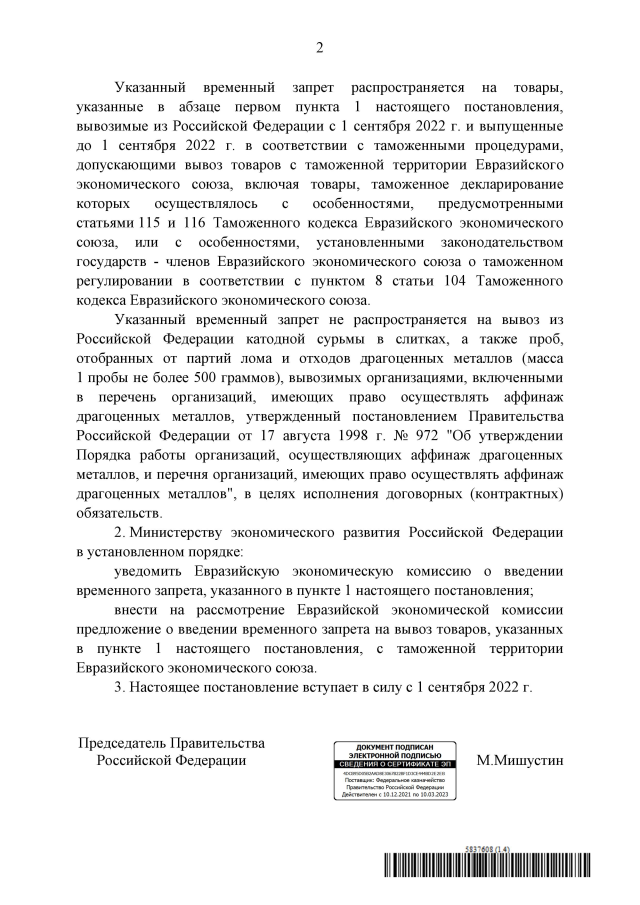 "Установить с 1 сентября 2022 года по 28 февраля 2023 года включительно временный запрет на вывоз из Российской Федерации отходов и лома драгоценных металлов или металлов, плакированных драгоценными металлами, прочих отходов и лома, содержащих драгоценный металл или соединения драгоценных металлов, используемых главным образом для извлечения драгоценных металлов ..., являющихся существенно важными для внутреннего рынка Российской Федерации", - говорится в документе.