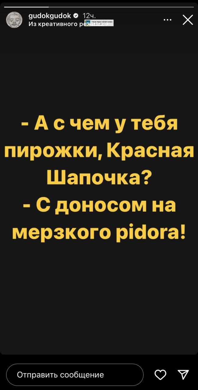 Шлыков, в свою очередь, считает, что посыл в песне направлен на унижение чести и достоинства по национальному признаку. По его мнению, изначально Гудков хотел высмеять певца, но в итоге целью стали все русские люди. В ответ на новости об этом юморист в своем блоге поиронизировал над просьбой Шлыкова к Следкому — он написал, что пирожки у Красной Шапочки с «доносом на мерзкого pidora».
