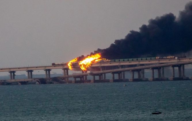 Цистерна с топливом загорелась на Крымском мосту, движение по нему остановлено.