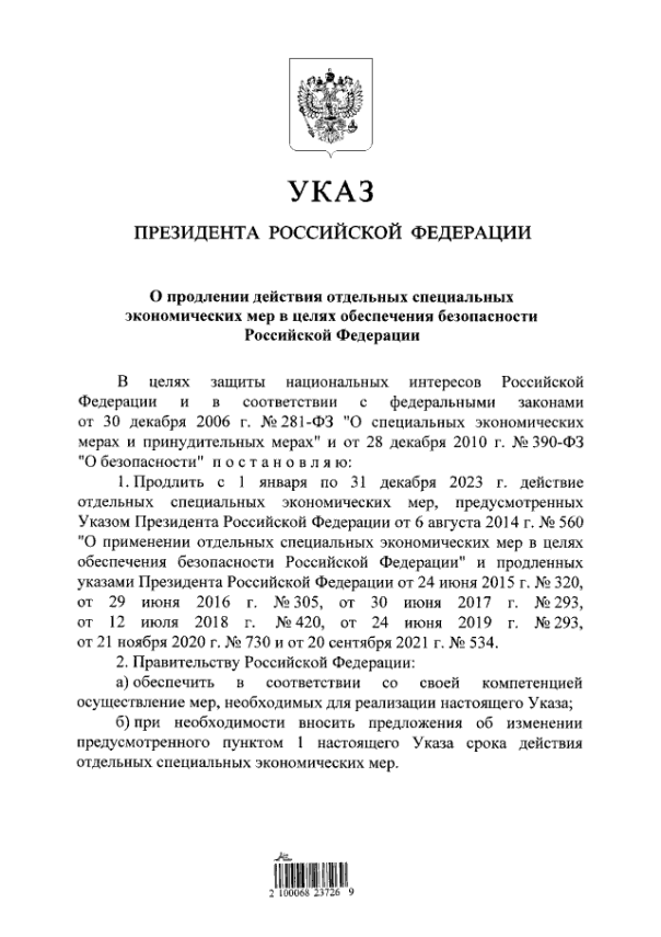 "Постановляю: продлить с 1 января по 31 декабря 2023 года действие специальных экономических мер, предусмотренных указом президента Российской Федерации от 6 августа 2014", - говорится в документе.