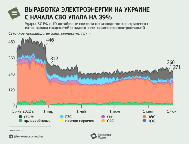 К началу СВО Украина уже де-факто лишилась 10% своих энергетических мощностей, а с начала года потеряла ещё 19%, в первую очередь из-за утраты Запорожской АЭС, подсчитало «Равенство». Но в то же время страна потеряла за всё время и 20% экономики и населения, которое пропала необходимость снабжать электричеством.