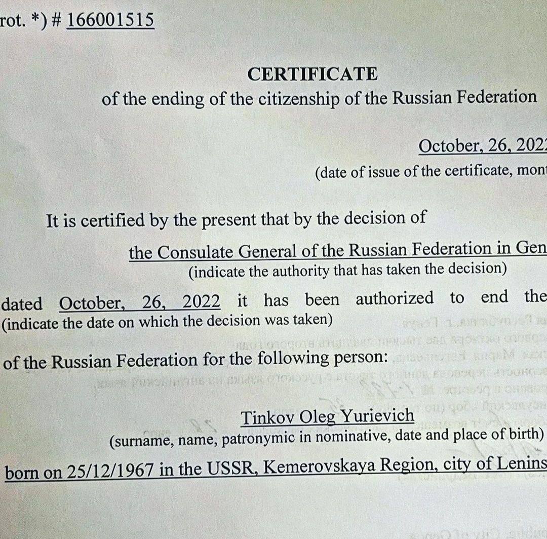 Основатель и бывший владелец Тинькофф Банка решил отказаться от российского гражданства в знак протеста против военных действий на Украине