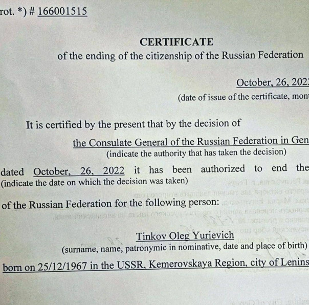 Бизнесмен Олег Тиньков в соцсетях сообщил, что отказывается от российского паспорта. Документ на английском языке, в котором говорится о выходе Тинькова из российского гражданства, Тиньков опубликовал в «Инстаграме» (принадлежит компании Meta, которая признана в России экстремистской и запрещена).