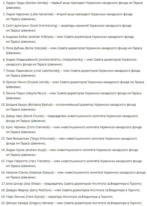 «В их числе — высокопоставленные чиновники, отставные и действующие парламентарии, правоохранители, представители экспертных кругов, а также активисты многочисленных пробандеровских структур и организаций, непосредственно обслуживающих русофобский курс режима Дж.Трюдо», — сказано в заявлении.