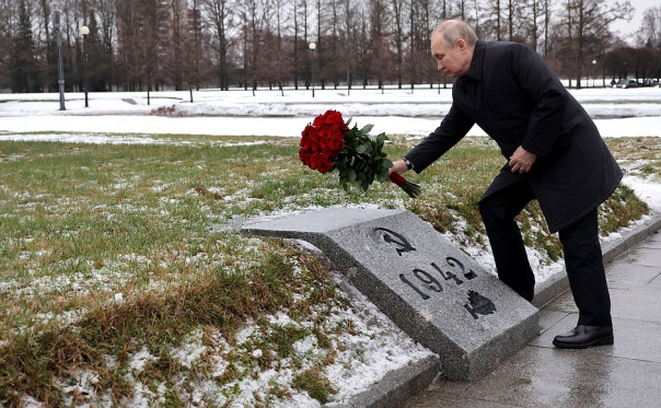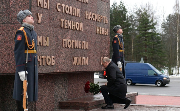 В 80-ю годовщину прорыва блокады Ленинграда Владимир Путин принял участие в церемонии возложения венка к монументу «Мать-Родина» на Пискарёвском мемориальном кладбище.