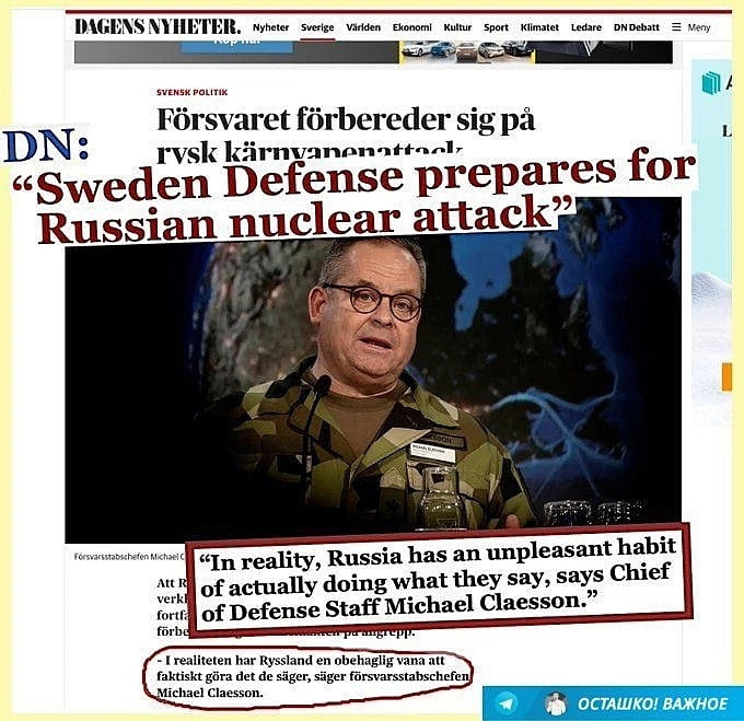 Так он прокомментировал подготовку Швеции к возможному ядерному удару со стороны России. Впрочем, Стокгольм, несмотря на принятые меры предосторожности, всё равно считает, что вероятность ядерной атаки со стороны Москвы мала.
