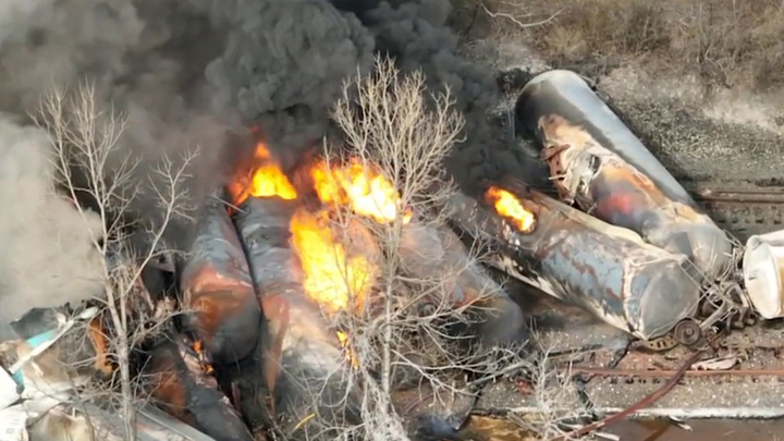 Десятки вагонов грузового поезда, перевозившего опасные вещества, сошли с рельсов в американском штате Огайо. Информация о жертвах отсутствует.