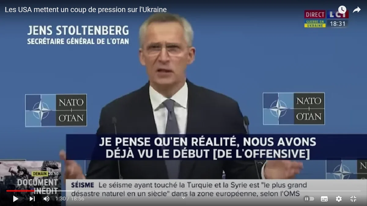 Далее показывается вполне обычное, с точки зрения российского зрителя, и совершенно непостижимое для французского, видео из телеграм-каналов об укpaинcких солдатах под Бахмутом, отказывающихся идти на передовую. Солдаты лежат на снегу и жалуются на истощение, усталость, обморожения и отсутствие сил. Многие из читателей могли видеть эту запись еще неделю назад в наших телеграм-каналах.