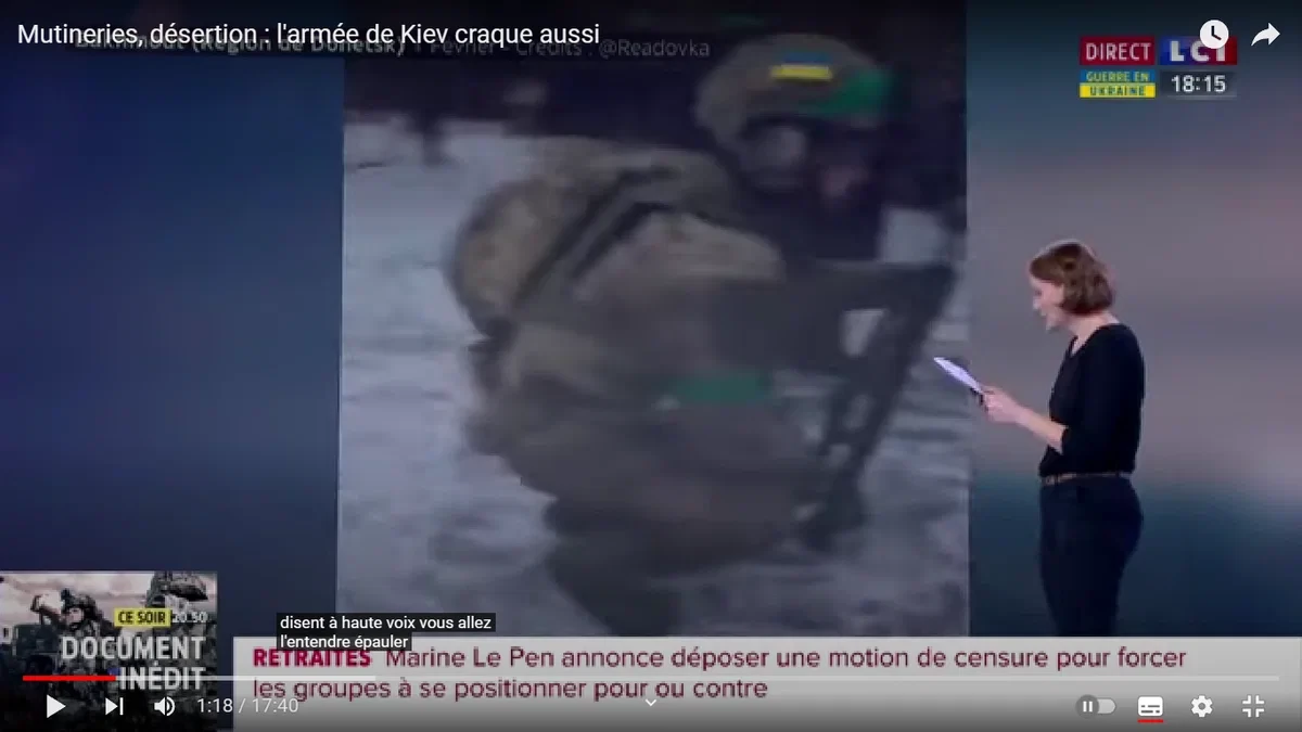 Ведущий Давид Пюжадас: "Сюжет, который мы сейчас покажем, это табу. На наших глазах начинают проявляться признаки того, что армия Укpaины трещит по швам, она перестала нормально функционировать, в ее рядах неповиновение...Русские ведут войну на истощение, и эта война, кажется, приносит результаты. Мы видим признаки истощения сил, признаки неповиновения, а иногда даже бунта в украинской армии. Об этом нам расскажет Фанни Вей".
