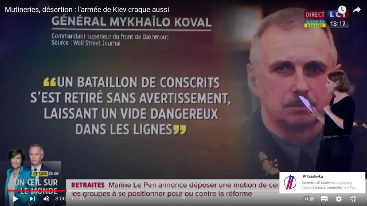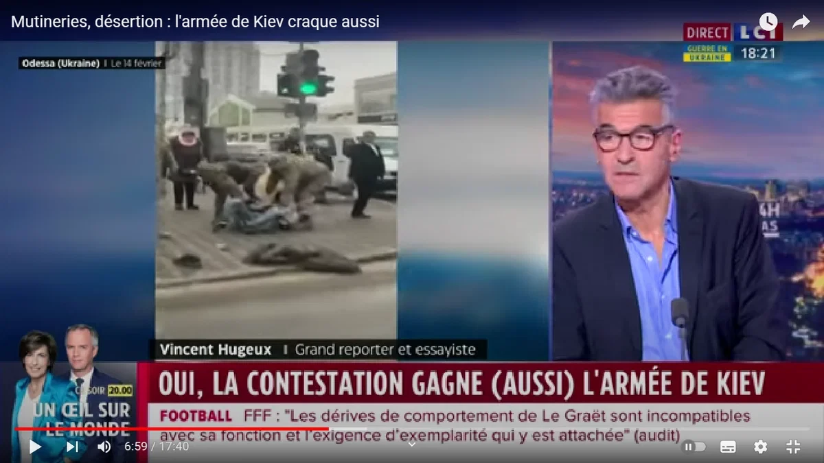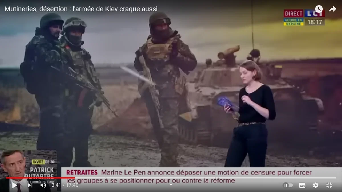 А вот это уже совсем неожиданно. Совершенно немыслимая еще пару недель назад передача появилась вчера на втором по значимости и насквозь пропагандистском телеканале Франции LCI. И название у нее соответствующее: "Бунты, дезертирство: армия Киeвa трещит" (на фр.). Как говорится, прорвало. Причем везде и сразу. По всем направлениям.