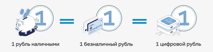 Все три формы российского рубля будут абсолютно равноценными: как сейчас 1 рубль наличными эквивалентен 1 безналичному рублю, так и 1 цифровой рубль будет эквивалентен каждому из них.
