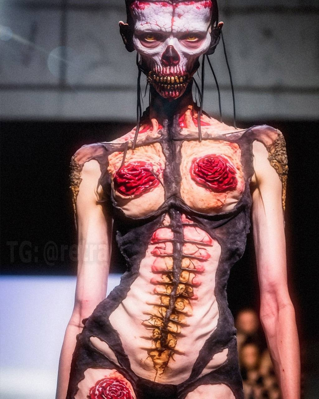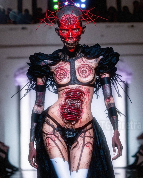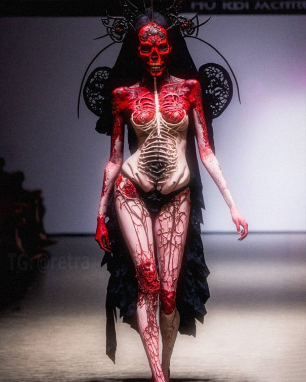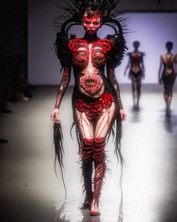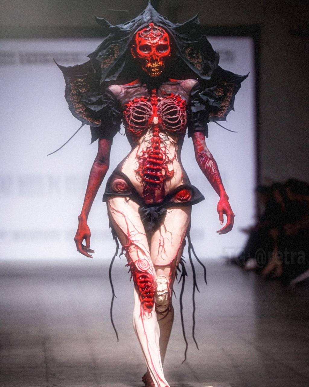 Графический дизайнер Роб Шеридан показал высокую моду в стиле «вечно мужающихся демонов ада, на которых садистски вырезаны произведения боди-арта, пропитанные кровью».
