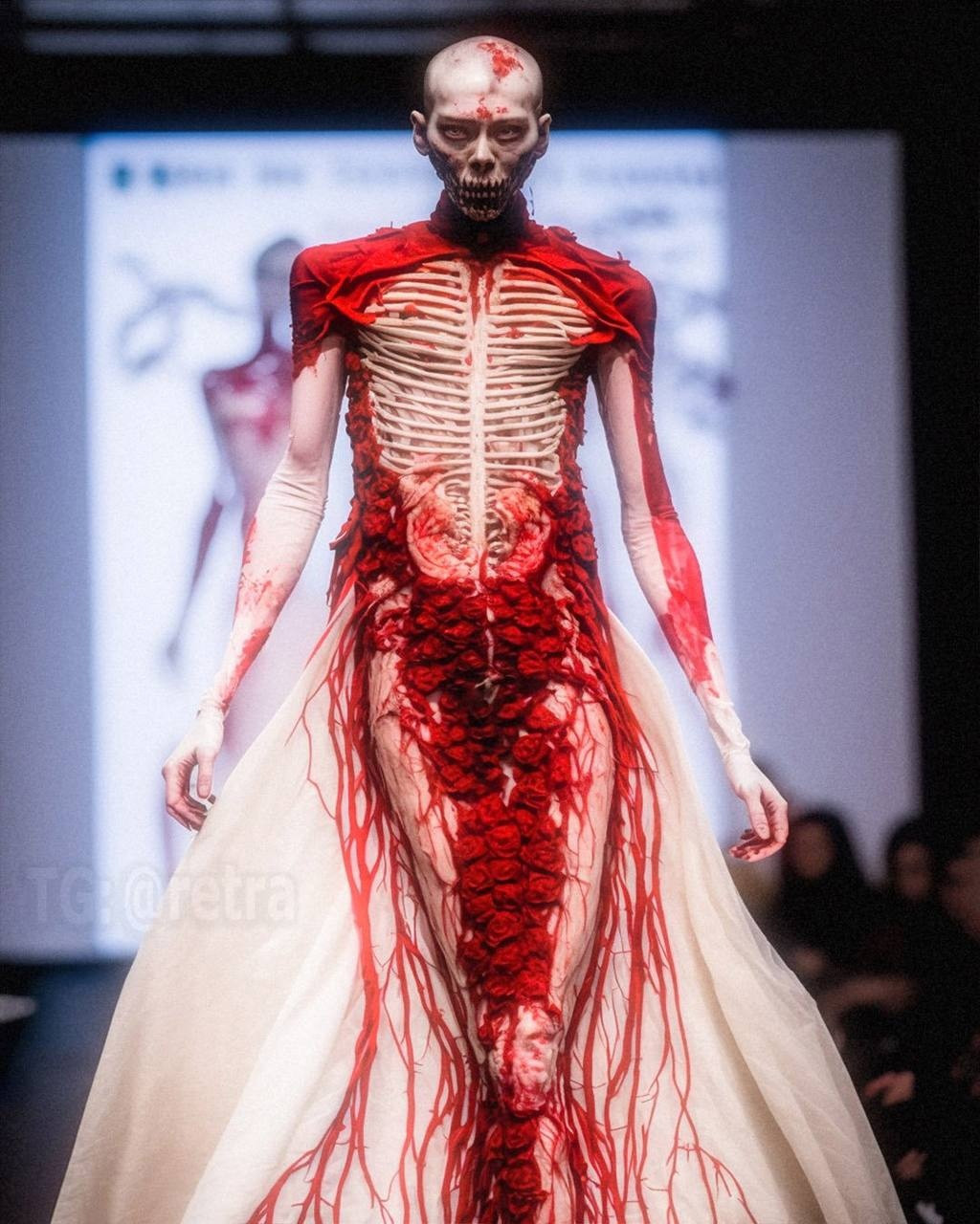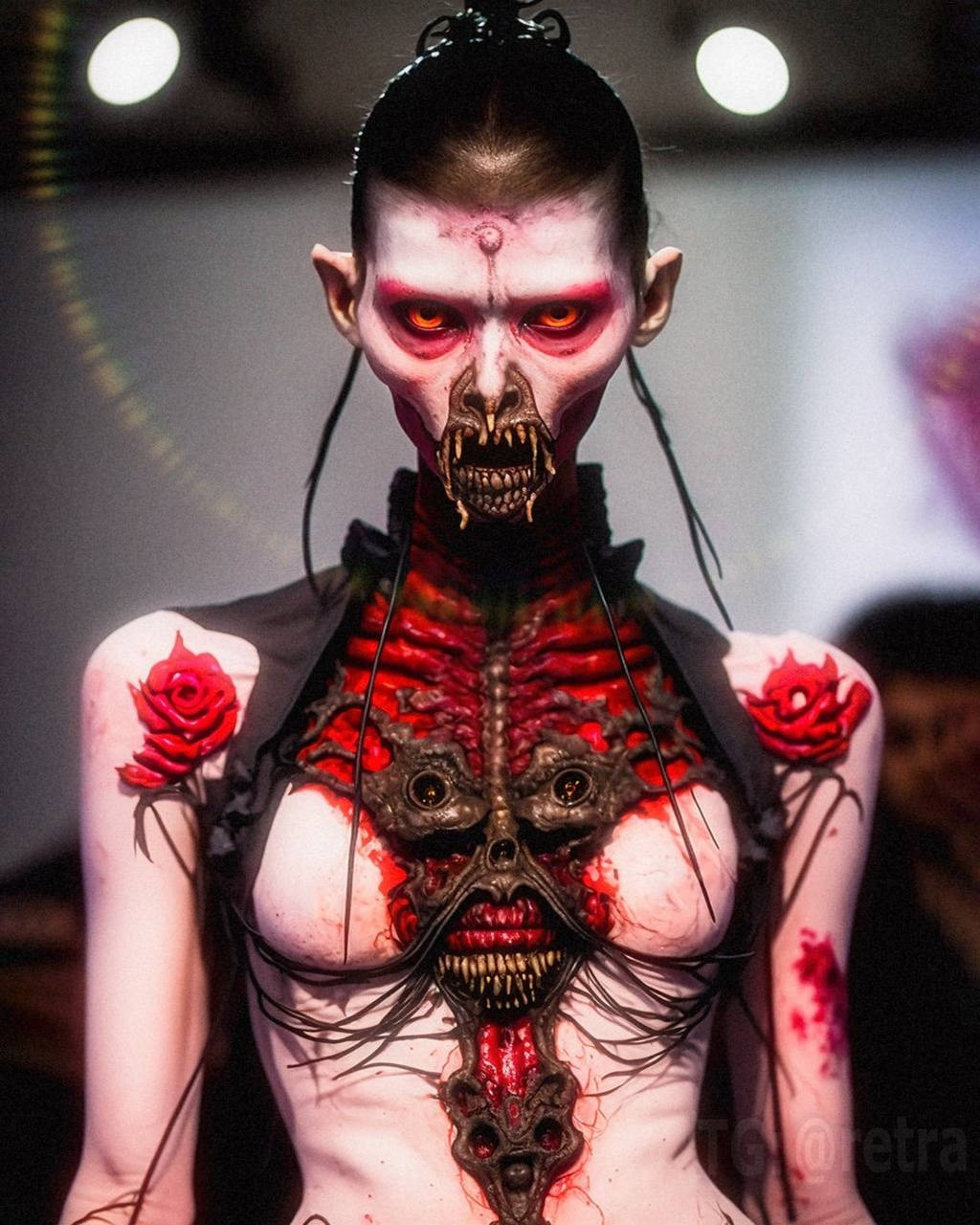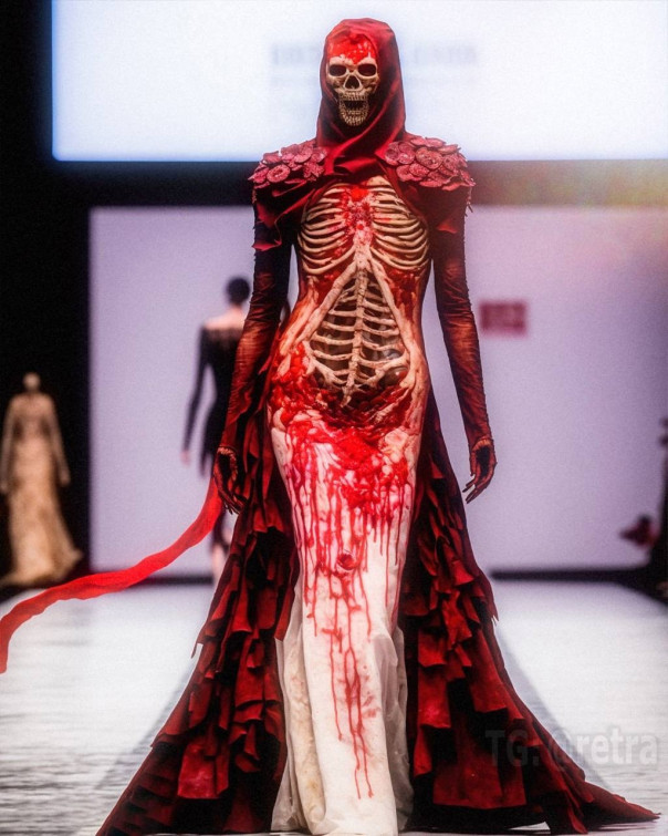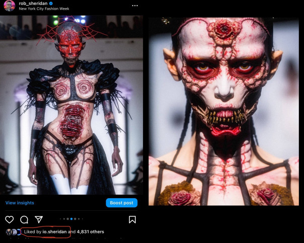 Графический дизайнер Роб Шеридан показал высокую моду в стиле «вечно мужающихся демонов ада, на которых садистски вырезаны произведения боди-арта, пропитанные кровью».