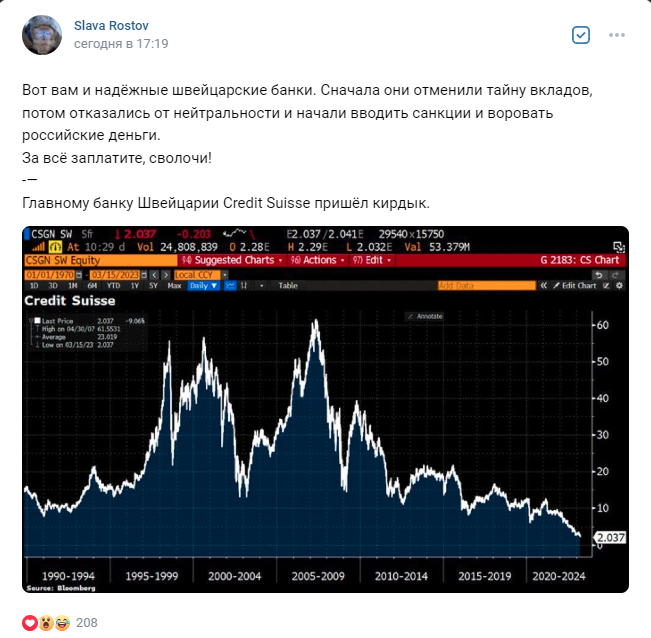Предыдущий рекорд котировки установили 13 марта, тогда на минимуме цена акции достигала отметки в 2,1 франка за штуку. Тогда на падение повлияла ситуация с обанкротившимся американским Silicon Valley Bank (SVB). За распродажей ценных бумаг разорившегося банка последовал обвал акций американских, а впоследствии и европейских банков. Крах одного из крупнейших банков США вызвал у инвесторов по всему миру опасения, что другие кредитные организации может ожидать та же участь, что и SVB.