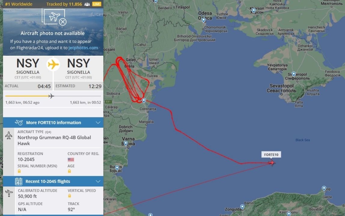 Данный борт взлетел с итальянской авиабазы Сигонелла, нарезал несколько кругов над Румынией и в данный момент продолжает полет над центральной частью Черного моря.