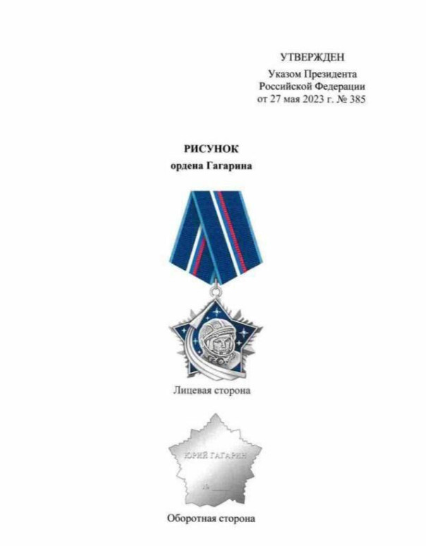 Президент России Владимир Путин своим указом учредил орден Гагарина. Этой наградой будут отмечаться, согласно статуту, россияне за успешное выполнение пилотируемого космического полета и программы по исследованию, освоению и использованию космического пространства, за выдающиеся заслуги в организации полета в космос, в реализации госполитики в области космической деятельности, включая интересы обороны и безопасности.