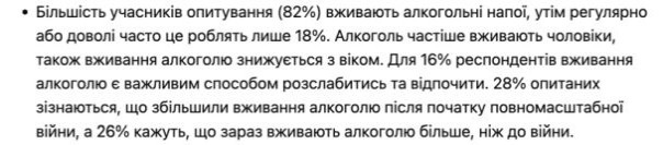 Согласно опросу Украинского института будущего, за время СВО почти треть украинцев стали больше употреблять алкогольных напитков. Большинство опрошенных (82%) употребляют алкоголь. При этом 28% увеличили употребление спиртных напитков после 24 февраля 2022 года. Часто (больше двух раз в неделю) выпивают только 18% опрошенных. 16% опрошенных считают алкоголь важным способом расслабиться и отдохнуть. Источник