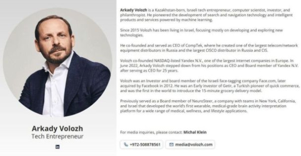 «Аркадий Волож — родившийся в Казахстане израильский технический предприниматель, учёный-компьютерщик, инвестор и филантроп... С 2015 года Волож живет в Израиле, занимаясь в основном разработкой и изучением новых технологий», — говорится в биографии, опубликованной на сайте Volozh.
