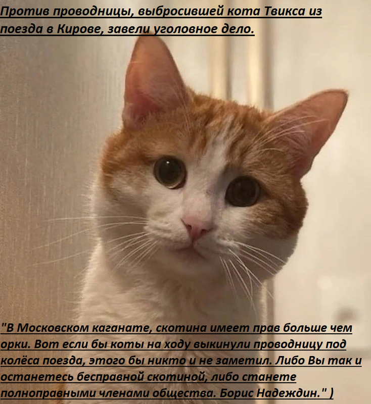 Напомним, Твикса везли домой после долгого лечения поездом из Екатеринбурга в Петербург. Домашний любимец находился в переноске, но выбрался и отправился гулять по вагону. Проводница выбросила рыжика на 25-градусный мороз на вокзале в Кирове. Сотрудница посчитала кота безбилетником.
