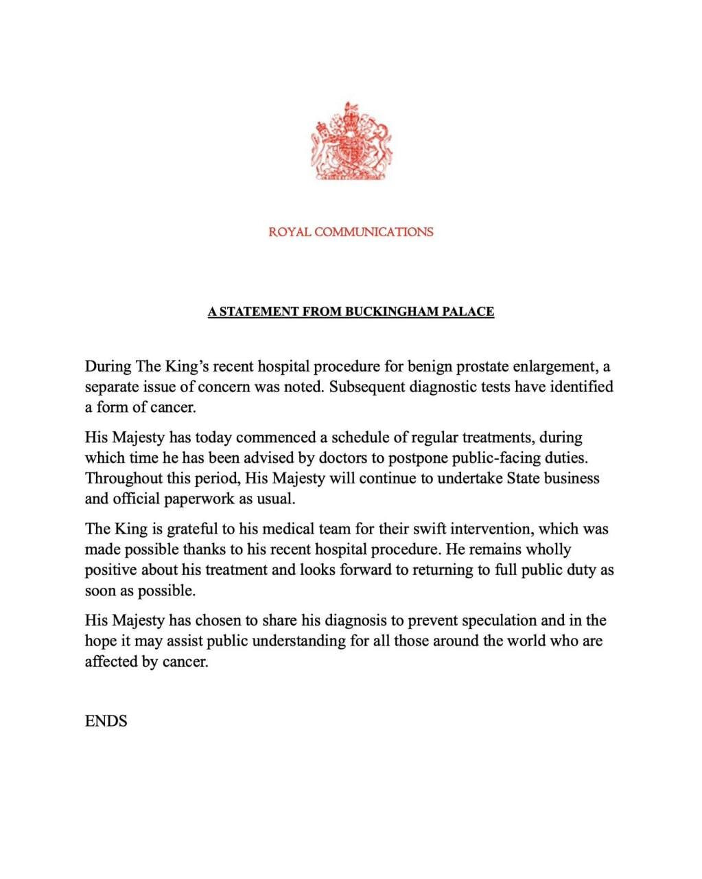 «Его Величество решил поделиться своим диагнозом, чтобы предотвратить спекуляции и в надежде, что это поможет общественному пониманию всех тех, кто во всем мире страдает от рака», — рассказали в Букингемском дворце.