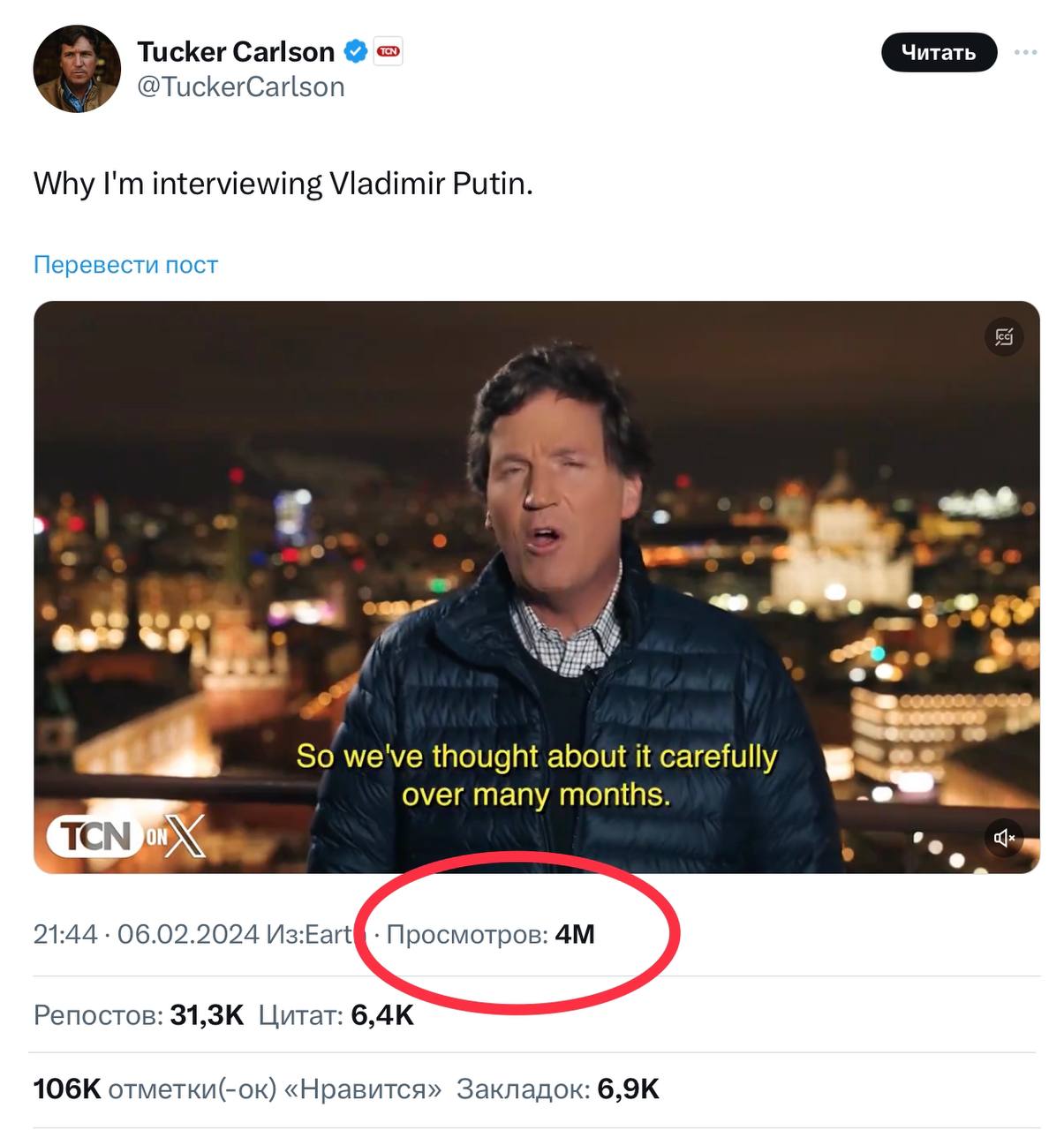 Такер благодарит Илона Маска за то, что тот разрешит опубликовать это интервью на платформе X (при прежнем руководстве его бы удалили).