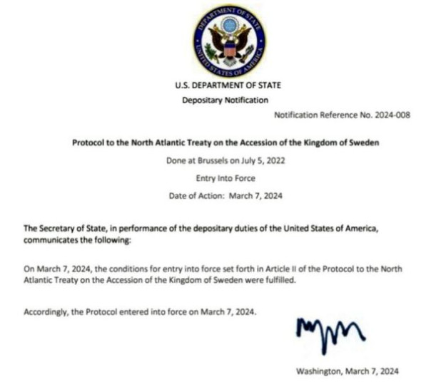 7 марта Швеция официально стала 32-м членом Североатлантического альянса. На сайте Госдепартамента США обнародован протокол о присоединении страны к НАТО, который вступил в силу с момента подписания.