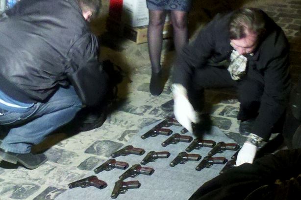 Около 21.00 с одной сумки вытащили оружие - 30 пистолетов. Пистолеты без магазинов и патронов. Милиция в этот момент разложила оружие и исследует ее. Место огорожено.