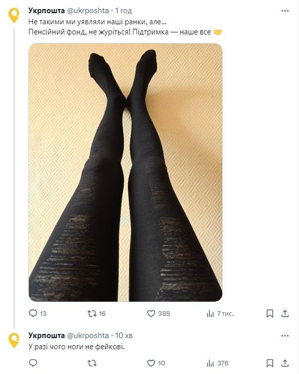 К троллингу пенсионного ведомства подключились даже чиновники. Так, Укрпочта в своем телеграм-канале опубликовала фото женских ног в черных колготах: "Пенсионный фонд, не унывайте! Поддержка — наше все!"