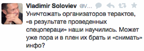 Владимир Соловьев в своем твиттере задал вопрос - может, уже есть смысл брать живыми и выбивать информацию?