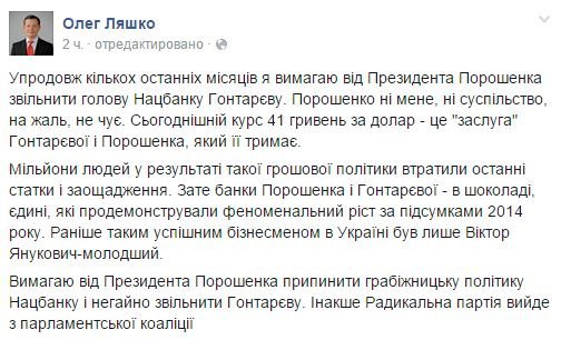 "Требую от Президента Порошенко прекратить грабительскую политику Нацбанка и немедленно уволить Гонтареву. Иначе Радикальная партия выйдет из парламентской коалиции", - написал Ляшко.