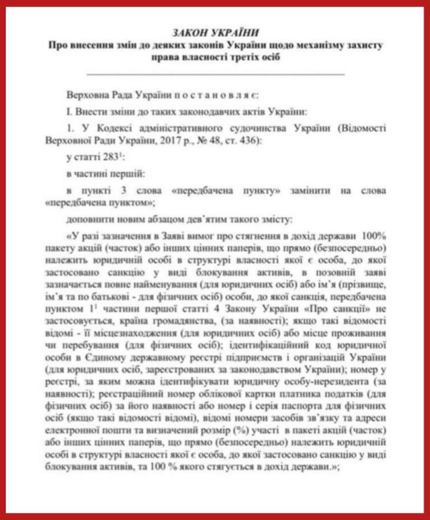 Суть схемы: устанавливается механизм конфискации предприятий, если в составе собственников есть лицо, к которому СНБО применил экономические санкции.