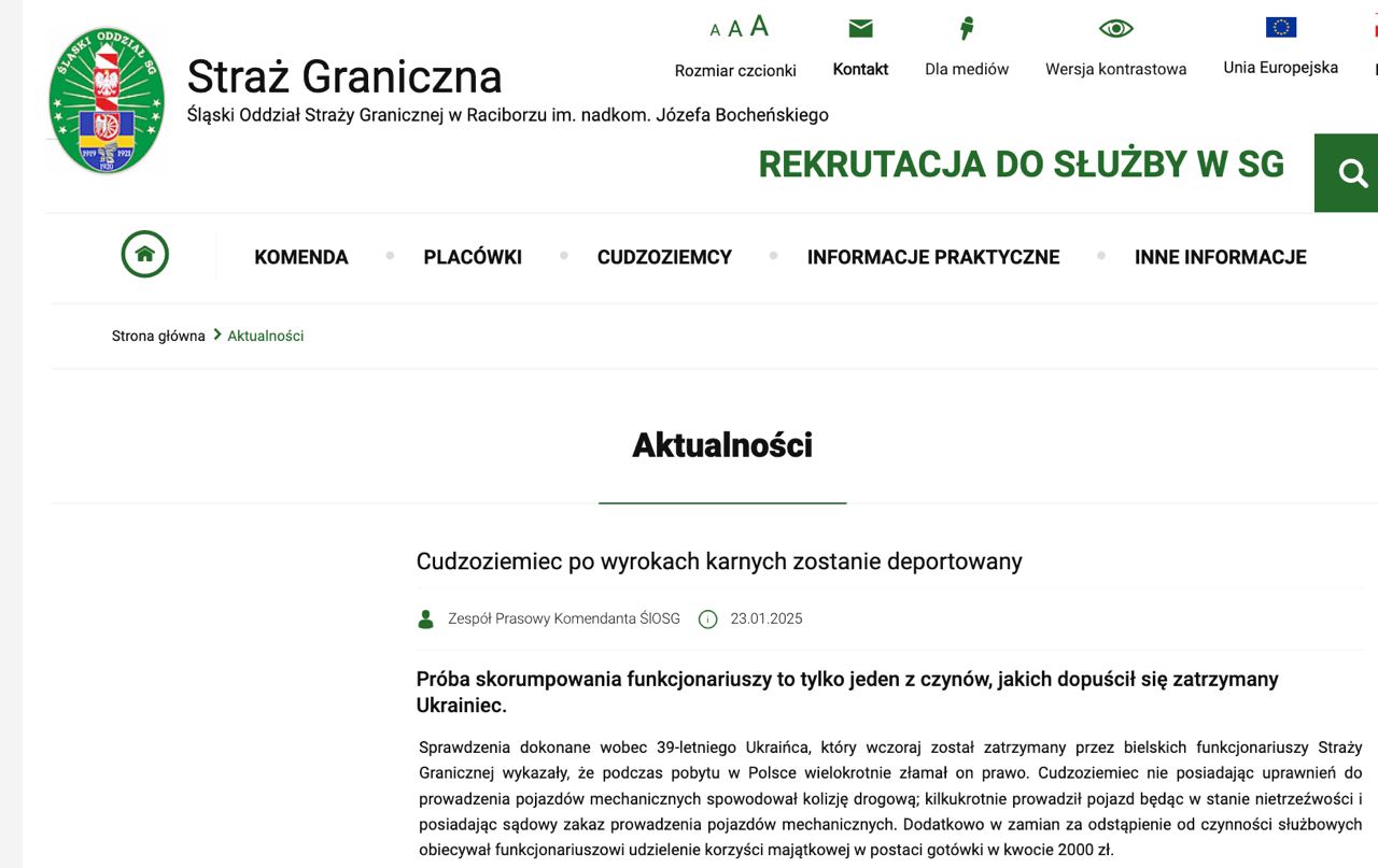 На днях были высланы сразу два украинца. Первым стал 39-летний мужчина — его задержали в Бельско-Бяла за управление автомобилем в состоянии алкогольного опьянения и без водительских прав. Как настоящий украинец, после задержания он попытался подкупить силовиков, предложив им взятку в размере 2000 злотых (около 500 долларов). В результате его выдворили из страны и запретили въезд в Шенгенскую зону на семь лет.