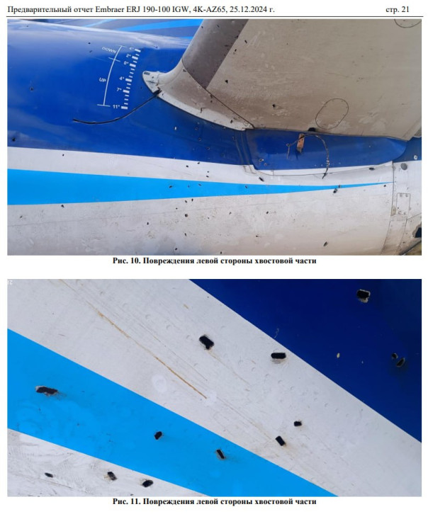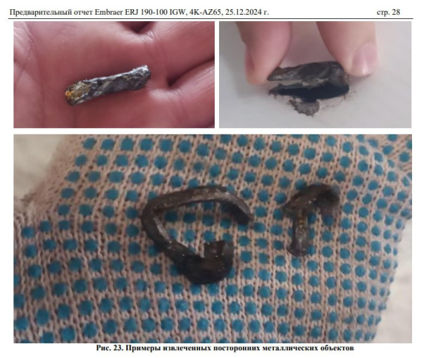 Минтранспорта Казахстана выпустило предварительный отчет по экспертизе крушения самолета Embraer «Азербайджанских авиалиний». Согласно опубликованным данным, в корпусе и гидросистеме зафиксированы глухие и сквозные повреждения. Из глухих повреждений было извлечено большое количество посторонних объектов, которые отправили на судебную экспертизу. Их происхождение пока не установлено.