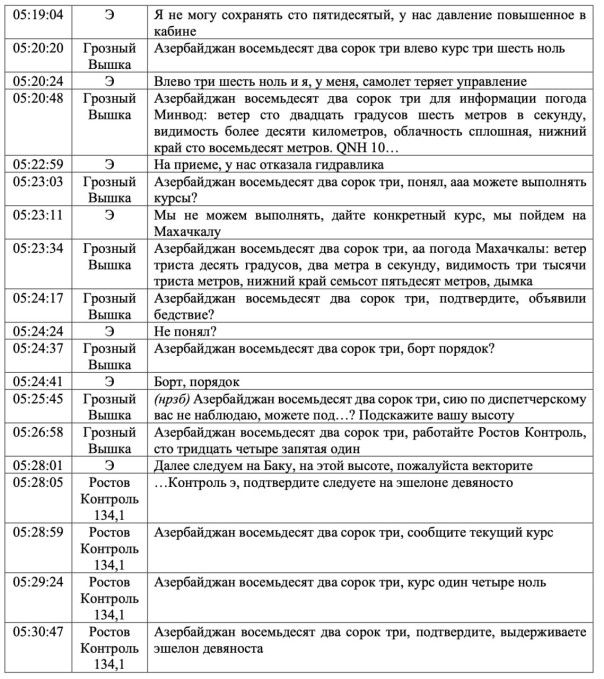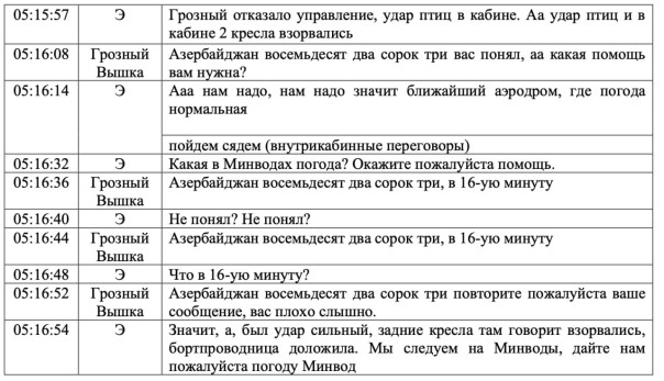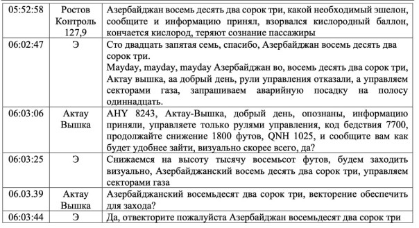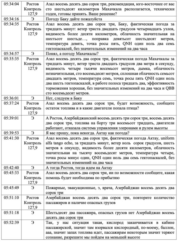 — Согласно расшифровке переговоров, пилоты судна сами приняли решение лететь в Актау, как и сообщалось ранее. Диспетчеры предоставили информацию о погоде в Махачкале и Минеральных Водах, однако экипаж полетел в Баку, но после принял решение сесть в Актау;