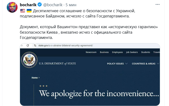 С сайта администрации президента США удалили 10-летний договор по безопасности, подписанный Джо Байденом и Владимиром Зеленским в июне 2024 года.