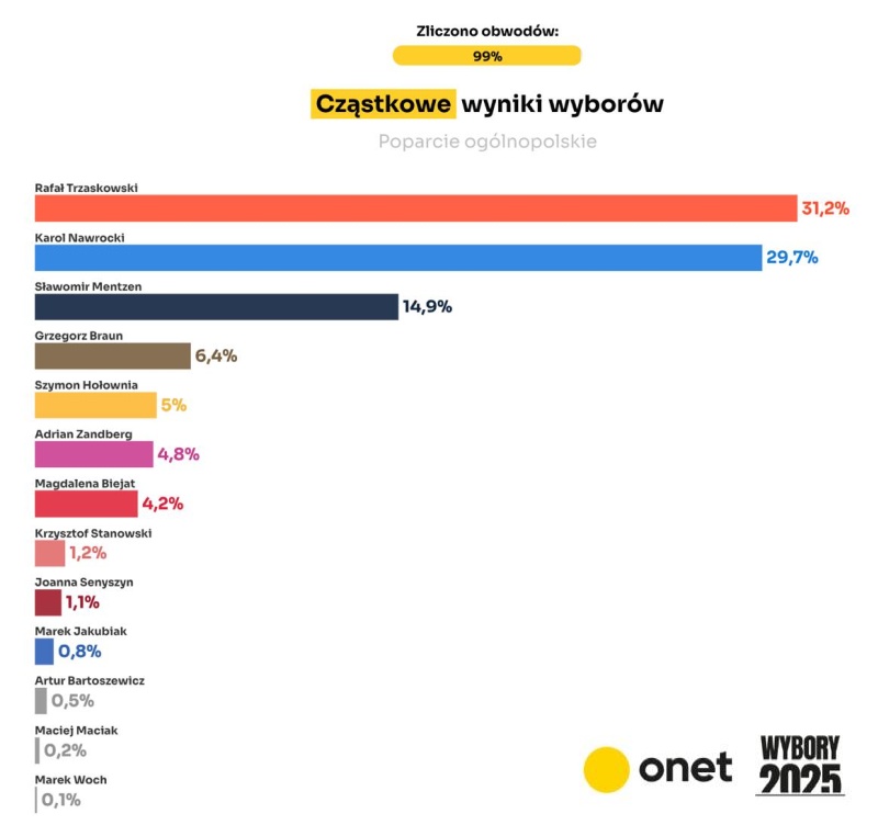 18 мая в Польше состоялся первый тур президентских выборов. По данным местных СМИ, ЦИК подсчитал уже 99% бюллетеней.
