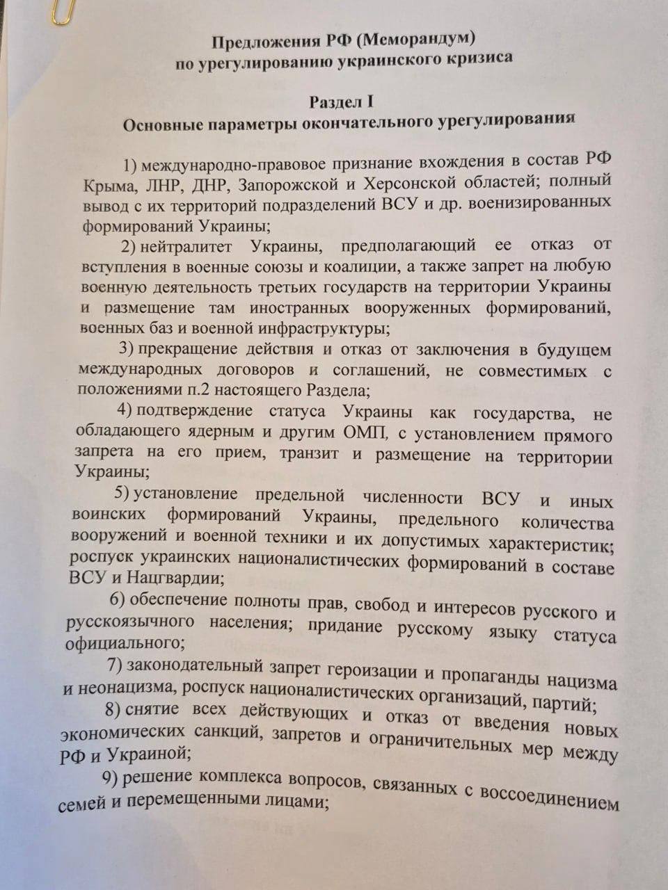Опубликован полный текст российского меморандума по Украине. Он состоит из трех разделов.
