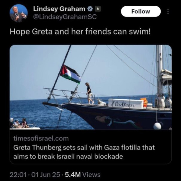 «Надеюсь, Грета и ее друзья умеют плавать!» — прокомментировал радовавшийся тому, что «русские умирают», американский сенатор Линдси Грэм*.