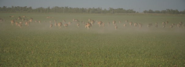 Дальше — больше: потоптаны и поедены 100 га сафлора, 50 га сорго, пшеничное поле сильно измято — перемещаясь по нему, сайгаки проделали огромное количество троп, основательно притоптав урожай.
