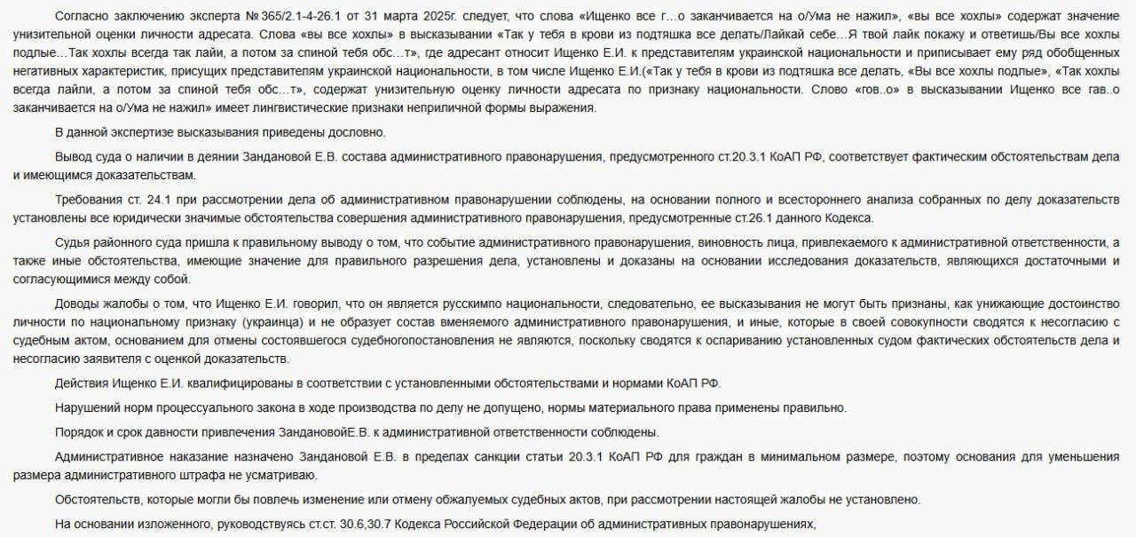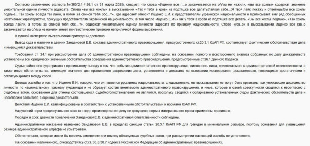 Согласно заключению экспертизы, в этих фразах содержится «унизительная оценка личности адресата по признаку национальности», а также они «приписывают ему ряд обобщённых негативных характеристик, присущих представителям украинской национальности».