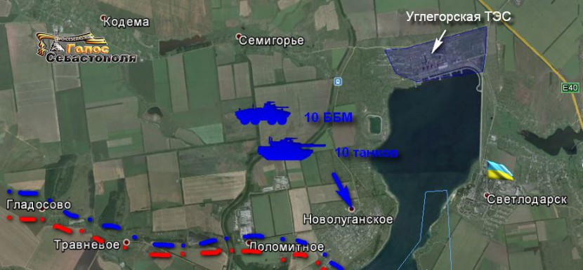 Ополченцы, занимающие позиции в районе Доломинтного и Травневого, сообщили, что ВСУ в районе Новолуганского получили подкрепление - около 10 ББМ и 4 танка. По данным разведки, украинские военные заминировали Углегорскую ТЭС и готовы её взорвать в случае наступления ВСН.