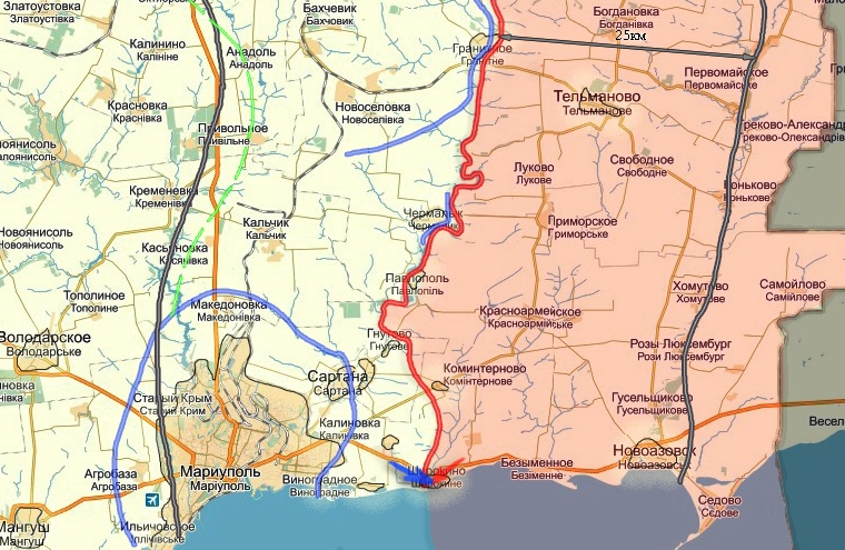 25 марта на фронтах Новороссии существенных изменений не произошло. Активные боевые действия по-прежнему пока заморожены, однако локальные бои продолжаются практически по всей линии соприкосновения. Наиболее горячими точками остаются село Широкино на юге ДНР, посёлок Пески и трасса Бахмутка.