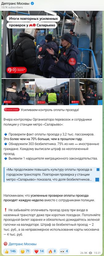 7 ноября Дептранс Москвы опубликовал пост о недавно прошедших проверках в московском транспорте. Там говорилось, что из 303 безбилетников 75% оказались ― иностранными гражданами.