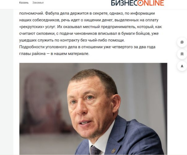 Ещё в апреле был задержан подчинённый Муллина – начальник отдела административно-технической инспекции администрации Нижнекамского района Ильдар Сафиуллин. Именно он выступал по бумагам как "рекрутёр", который якобы помог заключить контракты на военную службу десяткам бойцов. На деле, оказалось, эти бойцы на фронт уходили сами, и ни о каком рекрутёре Сафиуллине и не слышали.