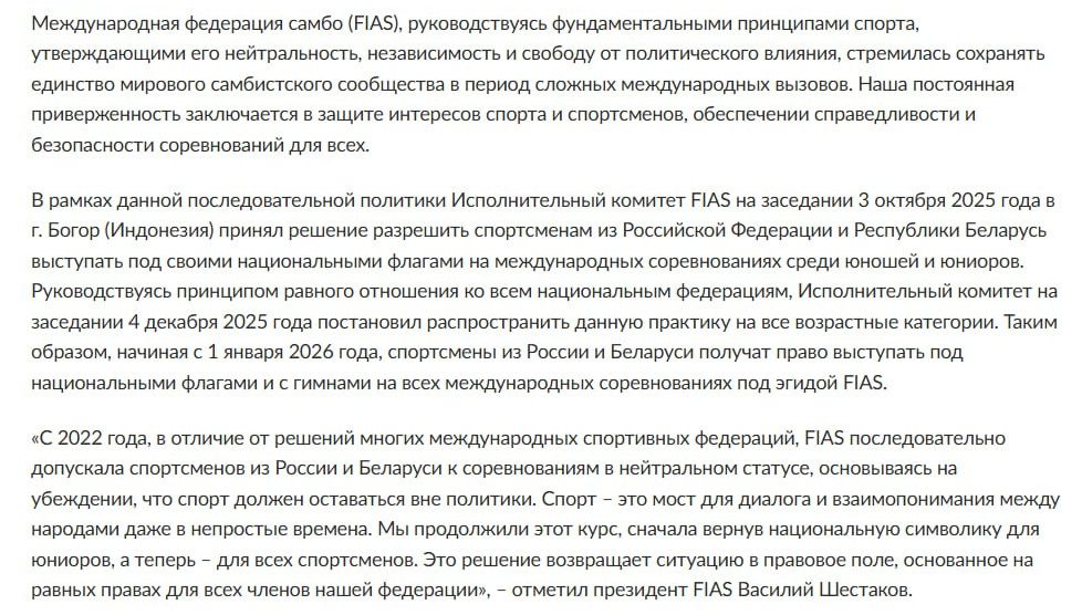 Международная федерация самбо (FIAS) разрешила русским и белорусским спортсменам участвовать в международных соревнованиях под национальной символикой — с флагами и гимнами своих стран, сообщил президент FIAS Василий Шестаков.