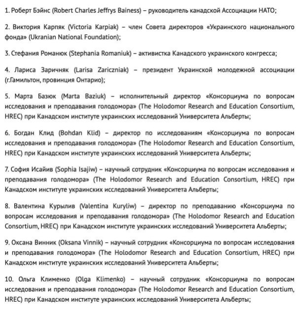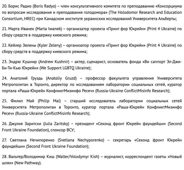 "В ответ на объявлявшиеся ранее официальной Оттавой неправомерные антироссийские ограничения въезд в Россию закрывается на постоянной основе для 28 канадских граждан, деятельность которых в структурах и организациях пробандеровского толка направлена на продвижение преступной неонацистской идеологии, ныне проповедуемой киевским режимом", — говорится в публикации.